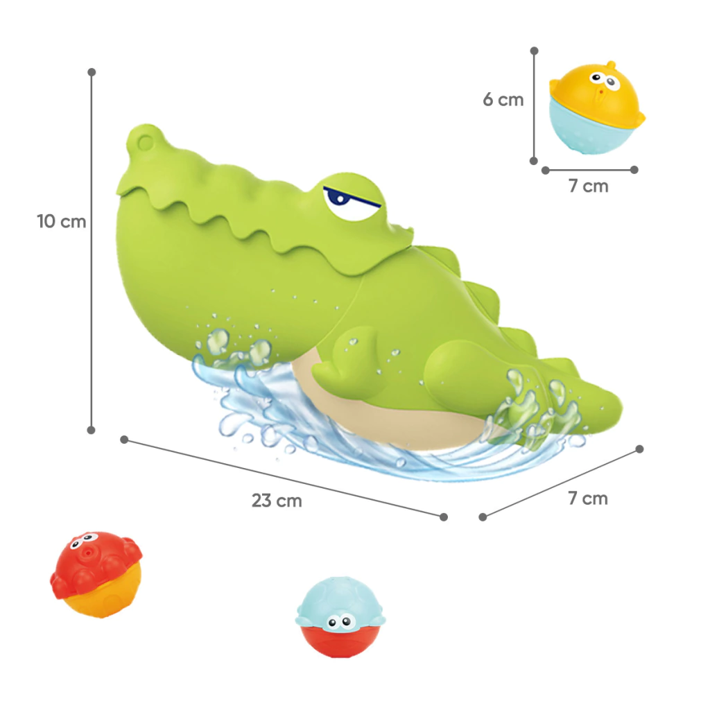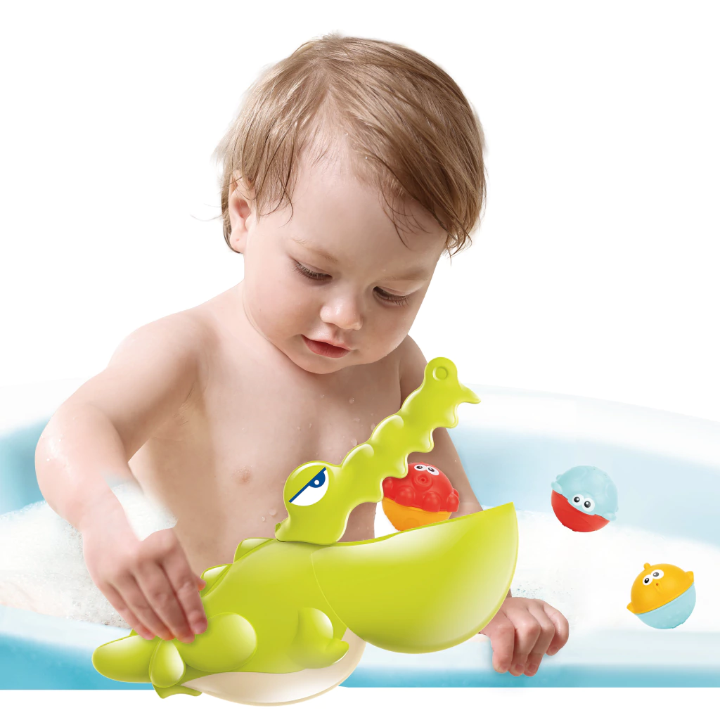 Un simpático cocodrilo que transforma la hora del baño en un juego interactivo. Presiona su botón y mira cómo abre la boca para atrapar las pelotitas flotantes.